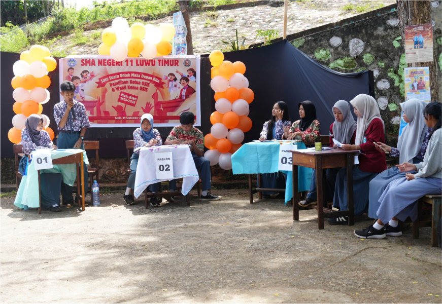 Debat yang diselenggarakan di SMAN 11 Luwu Timur ini menghadirkan para kandidat untuk menyampaikan visi, misi, serta program kerja mereka di hadapan guru dan siswa.