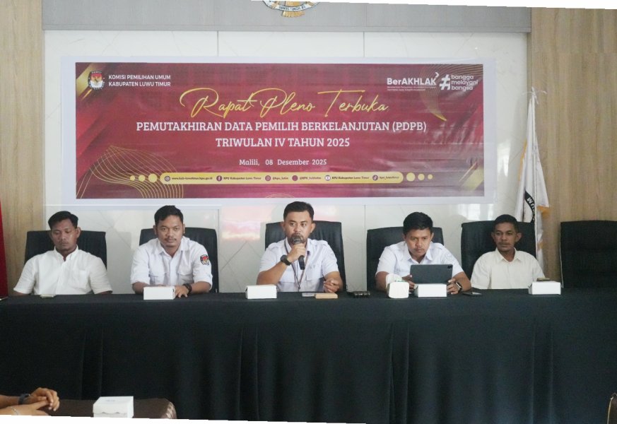 Komisi Pemilihan Umum (KPU) Kabupaten Luwu Timur menggelar Rapat Pleno Terbuka Rekapitulasi Pemutakhiran Data Pemilih Berkelanjutan (PDPB) Triwulan IV Tahun 2025, Senin (8/12).
