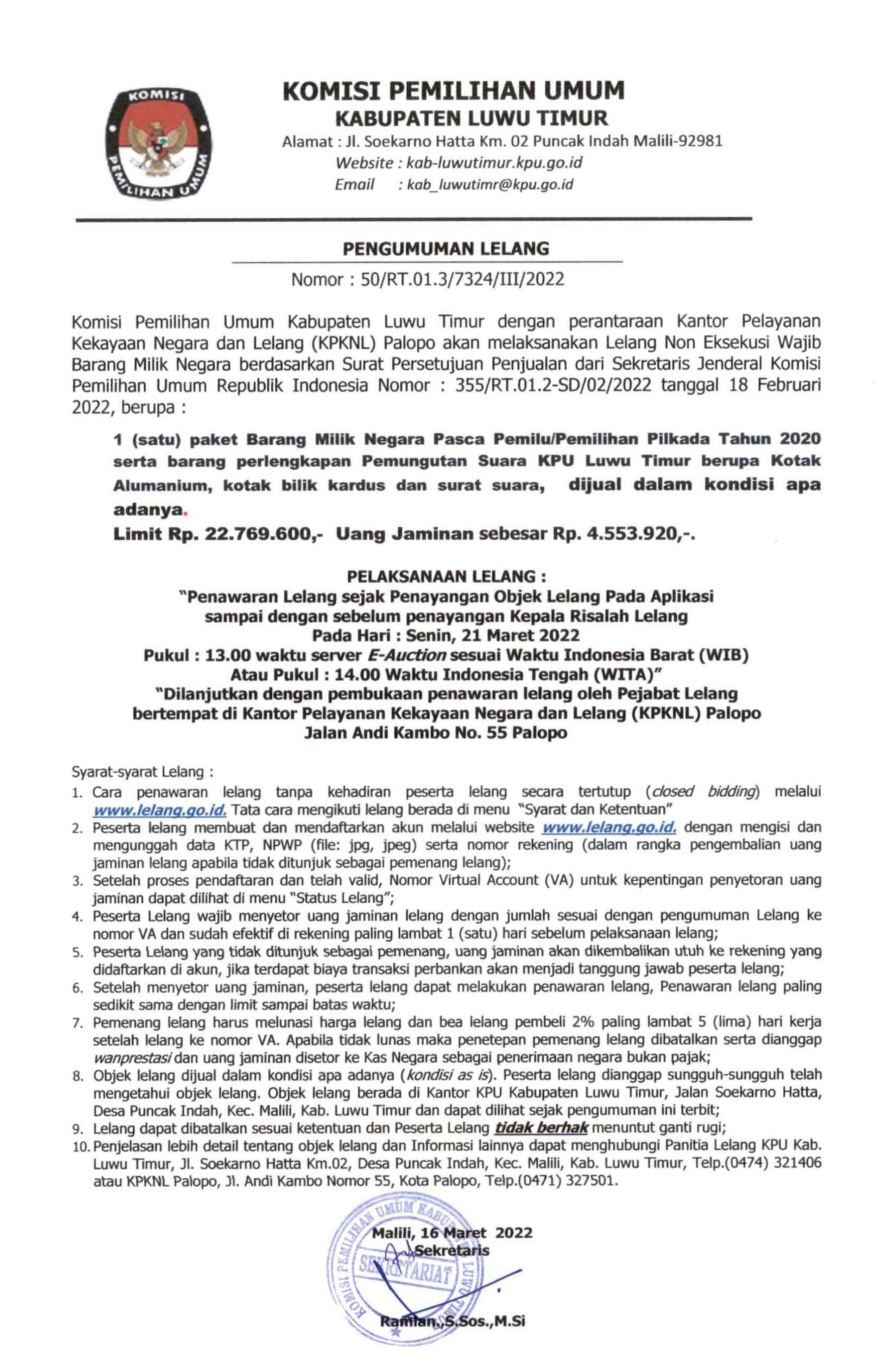Komisi Pemilihan Umum (KPU) Kabupaten Luwu Timur membuka Pengumuman Lelang satu paket barang milik Negara Pasca Pilkada Tahun 2020 serta barang perlangkapan Pemungutan Suara KPU Luwu Timur berupa Kotak Almunium, Kotak Bilik Kardus dan Surat Suara.