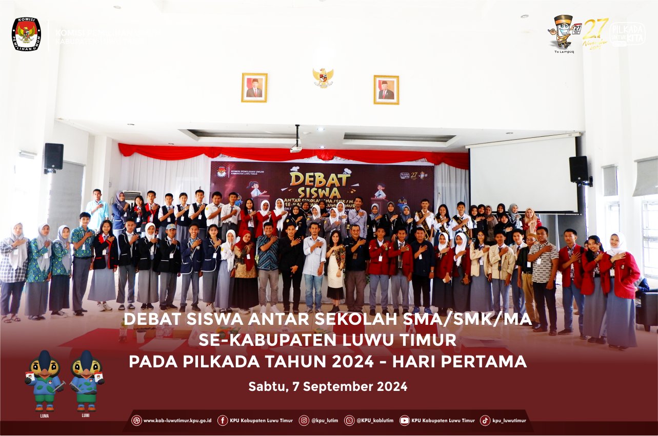Sebanyak 20 sekolah tingkat SMA/SMK/MA Se-Kabupaten Luwu Timur berpartisipasi dalam kegiatan Debat Siswa Antar Sekolah yang bertajuk Pilkada Untuk Kita, yang di selenggarakan Komisi Pemilihan Umum (KPU) Kabupaten Luwu Timur, bertempat di Gedung Wanita Simpurusiang Malili, Sabtu (7/9). Dibuka secara resmi Kadiv Hukum dan Pengawasan Ilhamuddin Alkadry, dalam sambutannya mengatakan tujuan utama kegiatan ini adalah untuk meningkatkan partisipasi pemilih pemula, khususnya para siswa/siswi. "Hampir semua sekolah yang ada di Kabupaten Luwu Timur mengikuti kegiatan debat siswa Pilkada ini. Ada sekitar 20 sekolah yang berpartisipasi hari ini,” jelasnya. Tambahnya menyebutkan bahwa selain mengasah kemampuan juga agar dalam pilkada nantinya generasi muda juga bisa berpartisipasi dalam pesta demokrasi dan tidak golput. Lebih lanjut ia mengatakan pemenang lomba debat antar siswa ini nantinya akan diikutkan lomba serupa di tingkat Provinsi Sulsel mewakili Kabupaten Luwu Timur. “Nantinya, juara satu dari Debat Siswa tingkat SMA/SMK/MA akan kami akomodir dan akomodasi untuk melakukan debat di provinsi melawan perwakilan dari 24 Kabupaten/Kota,” tandasnya. Kegiatan debat ini berlangsung selamat dua hari (7-8 September 2024). Adapun sekolah yang berpartisipasi dalam kegiatan ini antara lain: 1. SMAN 1 LUWU TIMUR 2. SMKN 2 LUWU TIMUR 3. SMAN 4 LUWU TIMUR 4. SMAN 3 Luwu Timur 5. SMAN 2 LUWU TIMUR 6. MAN LUWU TIMUR 7. SMK BUDI UTOMO SOROAKO 8. SMA YAPMAN SOROAKO 9. SMAN 10 LUWU TIMUR 10. SMA YPS SOROAKO 11. SMAN 5 LUWU TIMUR 12. SMAN 6 LUWU TIMUR 13. SMAN 13 LUWU TIMUR 14. MAS USWATUN HASANAH 15. SMAN 8 LUWU TIMUR 16. SMAN 12 LUWU TIMUR 17. SMAN 7 LUWU TIMUR 18. SMAN 9 LUWU TIMUR 19. MA. DARUNNAJAH TIMAMPU 20. SMK 1 LUWU TIMUR