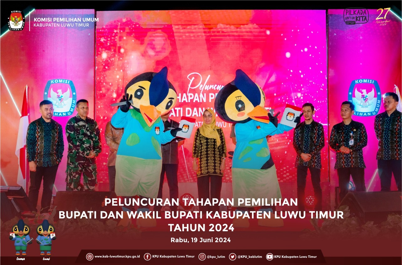 Komisi Pemilihan Umum (KPU) Kabupaten Luwu Timur gelar Peluncuran Tahapan dan Maskot Pemilihan Kepala Daerah (Pilkada) Luwu Timur 2024, bertempat di Andi Nyiwi Park Malili, Rabu (19/6).