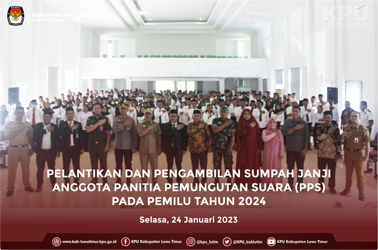Sebanyak 384 orang Panitia Pemungutan Suara (PPS) se Kabupaten Luwu Timur dari 128 desa dan kelurahan pada pemilu 2024, telah resmi dilantik pada hari Selasa (24/1/2023).