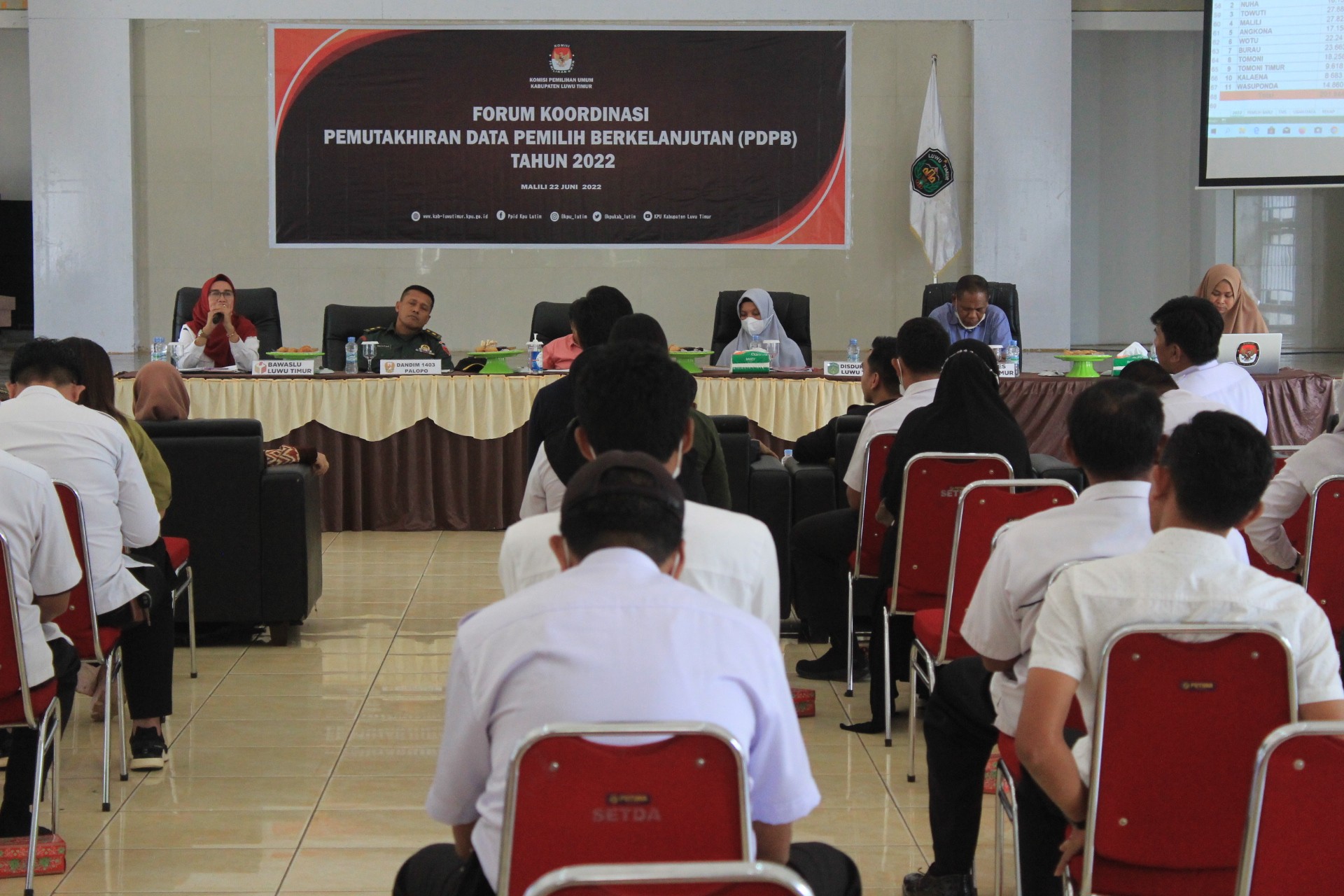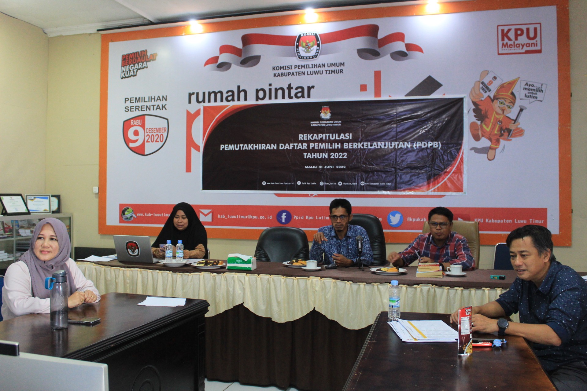 Komisi Pemilihan Umum (KPU) Kabupaten Luwu Timur Mengikuti Rapat Koordinasi Tindak lanjut Hasil Rekapitulasi Daftar Pemilih Berkelanjutan (PDPB) semester I Tahun 2022 Tingkat Nasional yang dilaksanakan oleh KPU Provinsi Sulawesi Selatan di Media Center KPU Luwu Timur, Senin (18/7). Kegiatan tersebut di hadiri oleh Anggota KPU Kabupaten Luwu Timur Divisi Perencanaan Data dan Informasi Hastuti, Kepala Sub Bagian Perencanaan Data dan Informasi Daipa Muh. Arpah bersama operator dan staf. Kegiatan ini dibuka oleh Plh Ketua KPU Provinsi Sulawesi Selatan Asram Jaya, yang dalam sambutannya menyampaikan beberapa hal terkait data pemilih dan kaitannya dengan pendaftaran Partai Politik serta Verifikasi Administrasi yang akan dilaksanakan. Dalam rapat Koordinasi yang dimaksud Koordinator Divisi Data dan informasi Uslimin, menyampaikan hasil Rapat Koordinasi Persiapan Pemutakhiran Data Pemilih Berkelanjutan Semester I Tahun 2022 Tingkat Nasional Dan Diskusi Sistem Manajemen Keamanan Informasi yang salah satu diantaranya adalah KPU Kabupaten/Kota tetap memaksimalkan koordinasi diwilayah masing-masing utamanya pada Pemerintah Desa atau Kelurahan terkait PDPB dan tindak lanjut data yang diturunkan oleh KPU RI.
