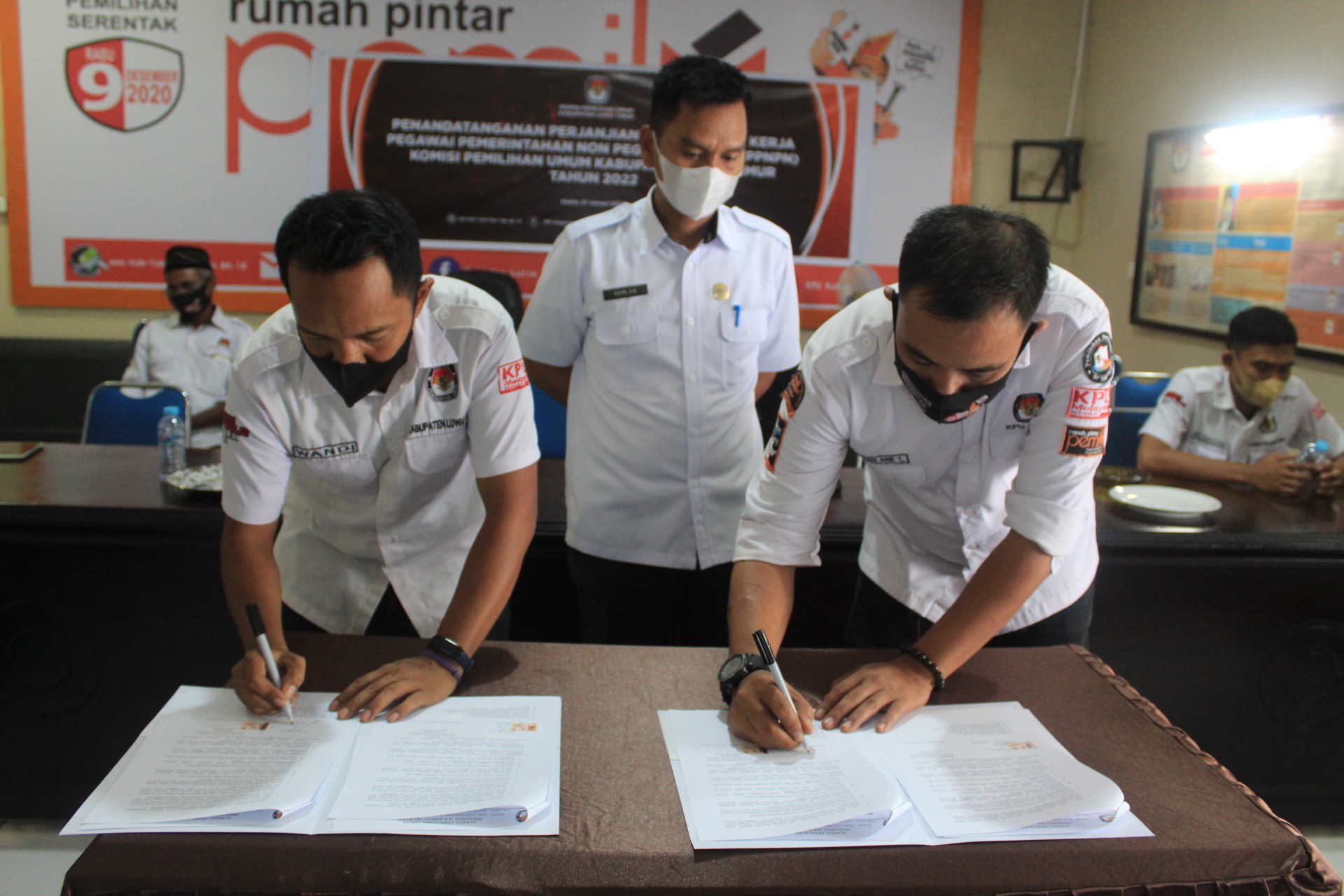 Kamis (27/1) Komisi Pemilihan Umum (KPU) Kabupaten Luwu Timur melaksanakan Penandatanganan Perjanjian Kesepakatan Kerja Pegawai Pemerintah Non Pegawai Negeri (PPNPN) KPU Luwu Timur bersama KPU Provinsi Sulawesi Selatan secara daring di Media Center. Hadir dalam kegiatan tersebut Ketua & Anggota KPU Luwu Timur, Sekretaris, Para Kasubbag serta seluruh Pegawai PPNPN di lingkup KPU Luwu Timur. Dalam kesempatan tersebut Sekretaris KPU Provinsi Sulawesi Selatan, Adnan Tahir berpesan kepada seluruh pegawai PPNPN agar bekerja sesuai dengan aturan. "Untuk teman-teman PPNPN di KPU Kabupaten/Kota, kami di KPU Provinsi akan selalu melakukan evaluasi setiap saat dan tidak lagi diakhir tahun, untuk itu saya berpesan kepada teman-teman semua agar bekerja dengan sepenuh hati sesuai dengan tuntuan, aturan dan harapan lembaga", ucapnya. Dalam kegiatan ini, masing-masing PPNP KPU Kabupaten Luwu Timur yang terdiri dari 10 orang melakukan Penandatangan Kesepakatan Perjanjian Kerja secara bergantian.