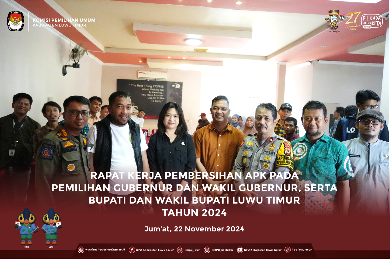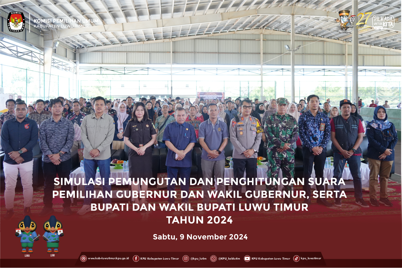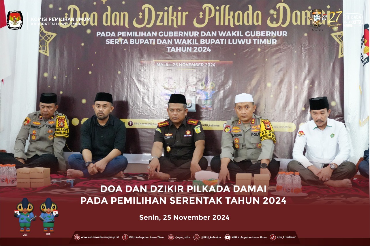 Dalam rangka mewujudkan Pemilu Damai 2024, Komisi Pemilihan Umum (KPU) Luwu Timur menggelar Doa dan Dzikir bersama pada Pemilihan serentak Tahun 2024. Kegiatan tersebut berlangsung di Kantor KPU Luwu Timur, Senin (25/11). Ketua KPU Kabupaten Luwu Timur, Irfan Lahabu mengatakan doa dan dzikir bersama digelar sebagai bentuk silaturahmi dan kelancaran agar pelaksanaan Pilkada serentak yang berlangsung pada 27 November 2024 mendatang dapat berjalan dengan lancar, aman dan damai. "Kami selalu berdoa agar Pilkada bisa berjalan dengan baik, tidak ada masalah, masyarakatnya aman, damai, situasi sejuk," katanya. Dalam kesempatan tersebut, dia menyatakan KPU berkomitmen mewujudkan Pilkada yang demokratis. "Pilkada demokratis menjadi komitmen kami semua, ini bisa terwujud apabila regulasi dijalankan dengan baik, birokrasi ASN, TNI, Polri netral, pesertanya taat aturan, pemilih cerdas dan partisipatif, serta penyelenggaranya berintegritas," ujarnya. Lanjutnya ia juga berharap, pelaksanaan Pilkada 2024 dapat berjalan dengan lancar, damai, dan tetap menjunjung tinggi nilai-nilai demokrasi. "Semoga Pilkada ini menjadi momen yang mendekatkan hati masyarakat satu sama lain", harapnya. Hadir dalam kegiatan ini Kapolres Luwu Timur, Kepala Kejaksaan Negeri Malili, Dandim 1403 Palopo, Pengadilan Negeri Malili, Kesbangpol Luwu Timur, Satpol PP, Depag Malili, Pengadilan Agama, Dinas Perhubungan, Media Pers serta santri dari Pondok Pesantren Al-Hidayah Malili.