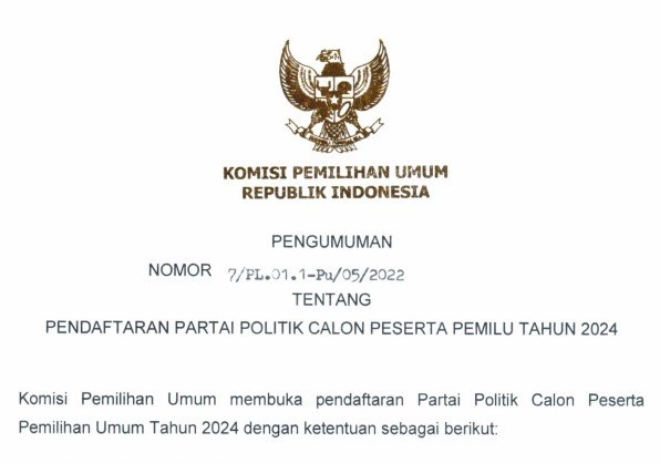 PENGUMUMAN NOMOR 7/PL.01.1-Pu/05/2022 TENTANG PENDAFTARAN PARTAI POLITIK CALON PESERTA PEMILU TAHUN 2024 << KLIK DI SINI